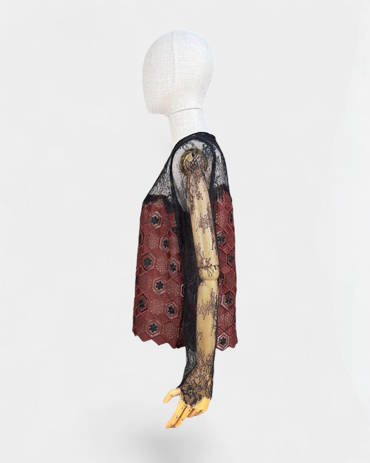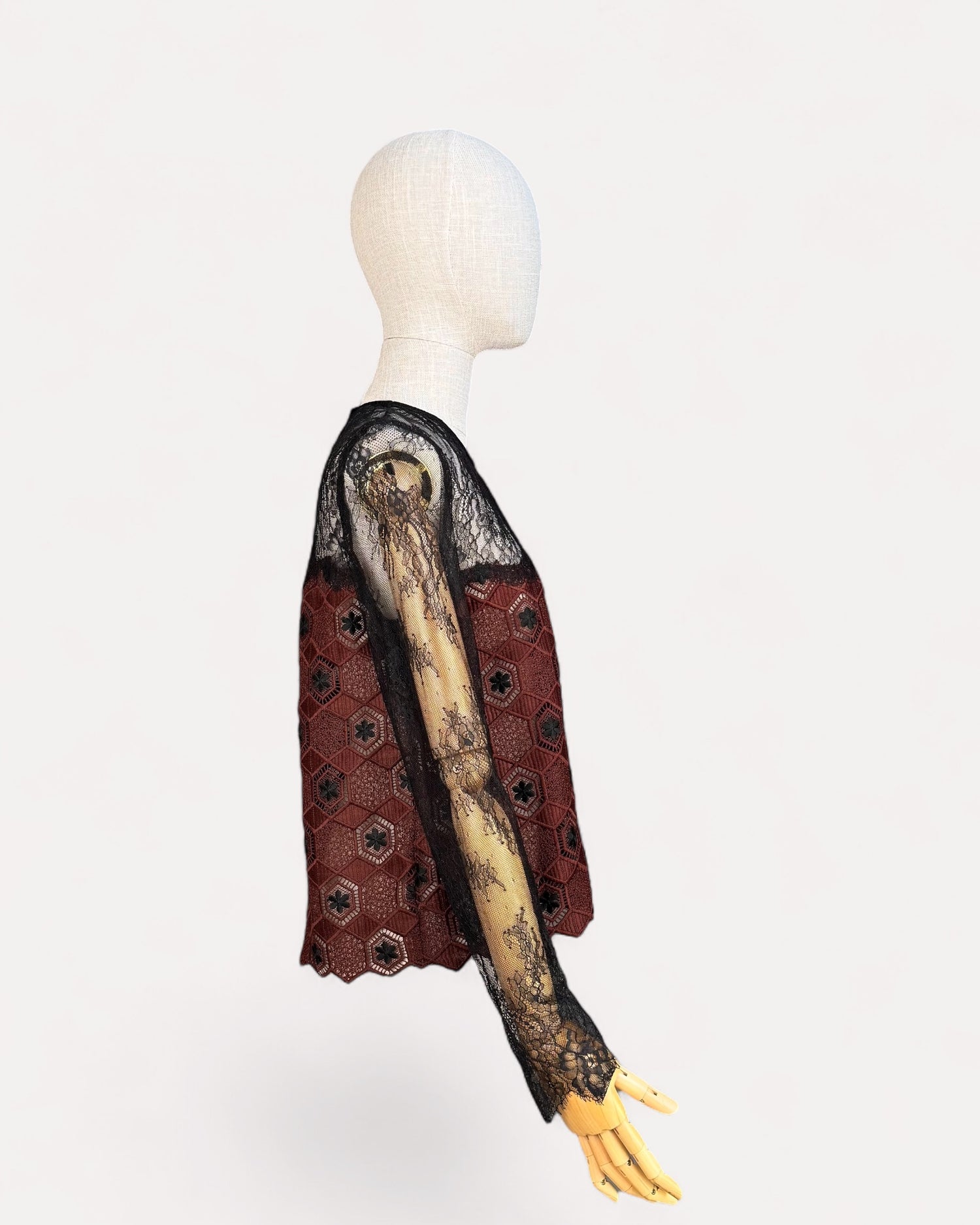 Blouse Sandro en dentelle noire et tissu bordeaux à motifs géométriques, élégante et moderne. Un modèle féminin et chic, facile à porter de jour comme de soirée.
