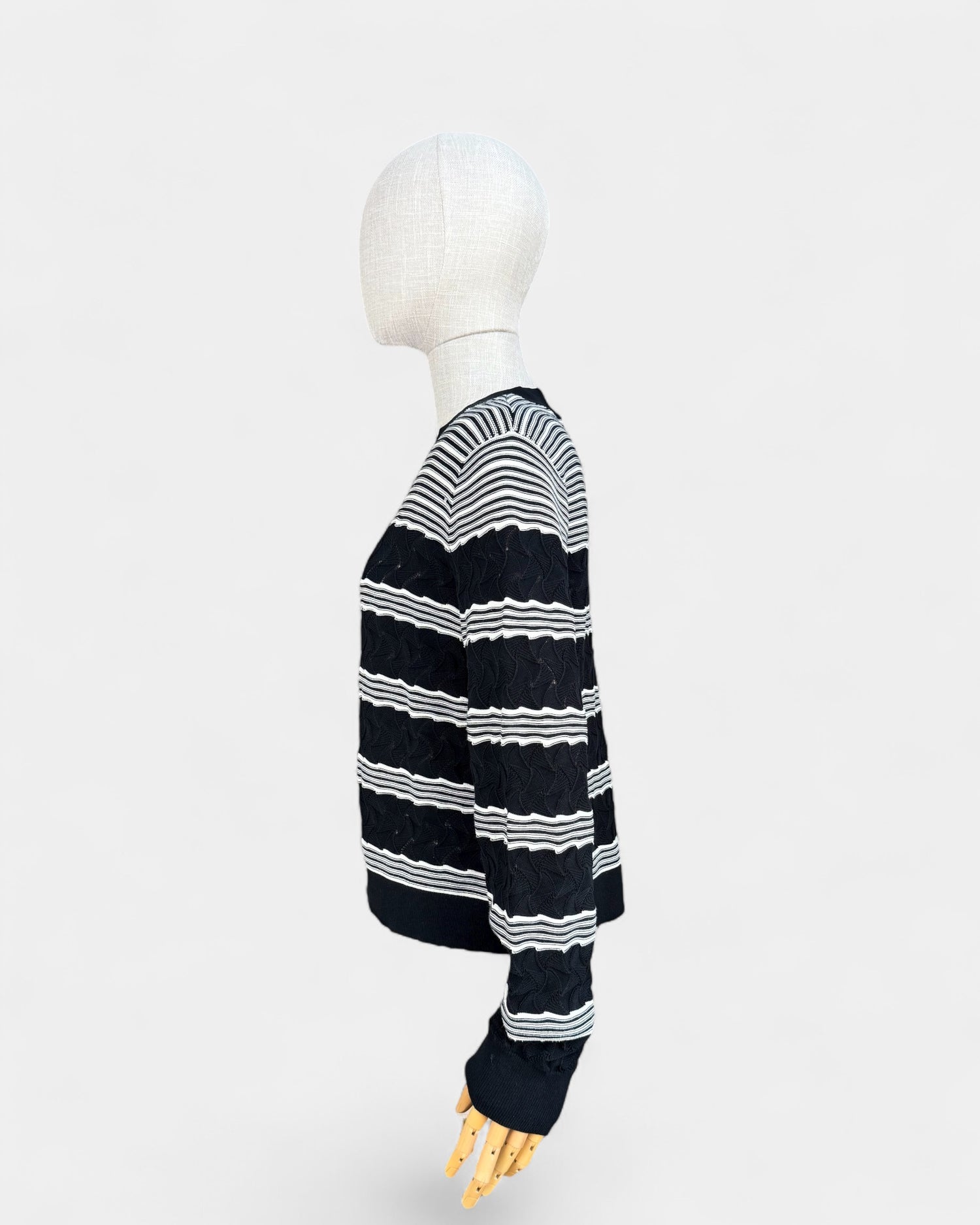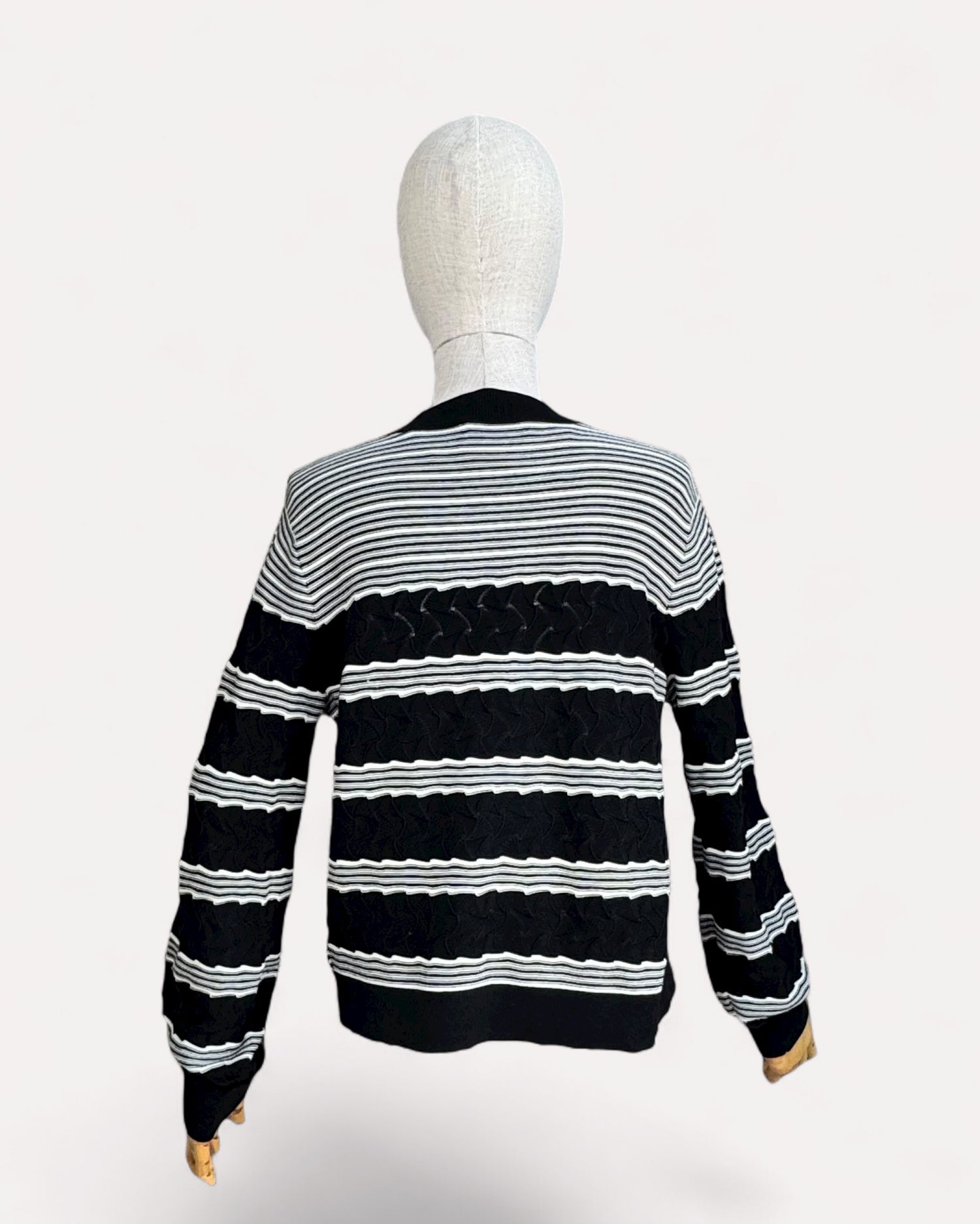 Pull à manches longues Club Monaco en maille épaisse, avec motif rayures noires et blanches. Encolure ronde et finitions côtelées aux poignets et à la base.