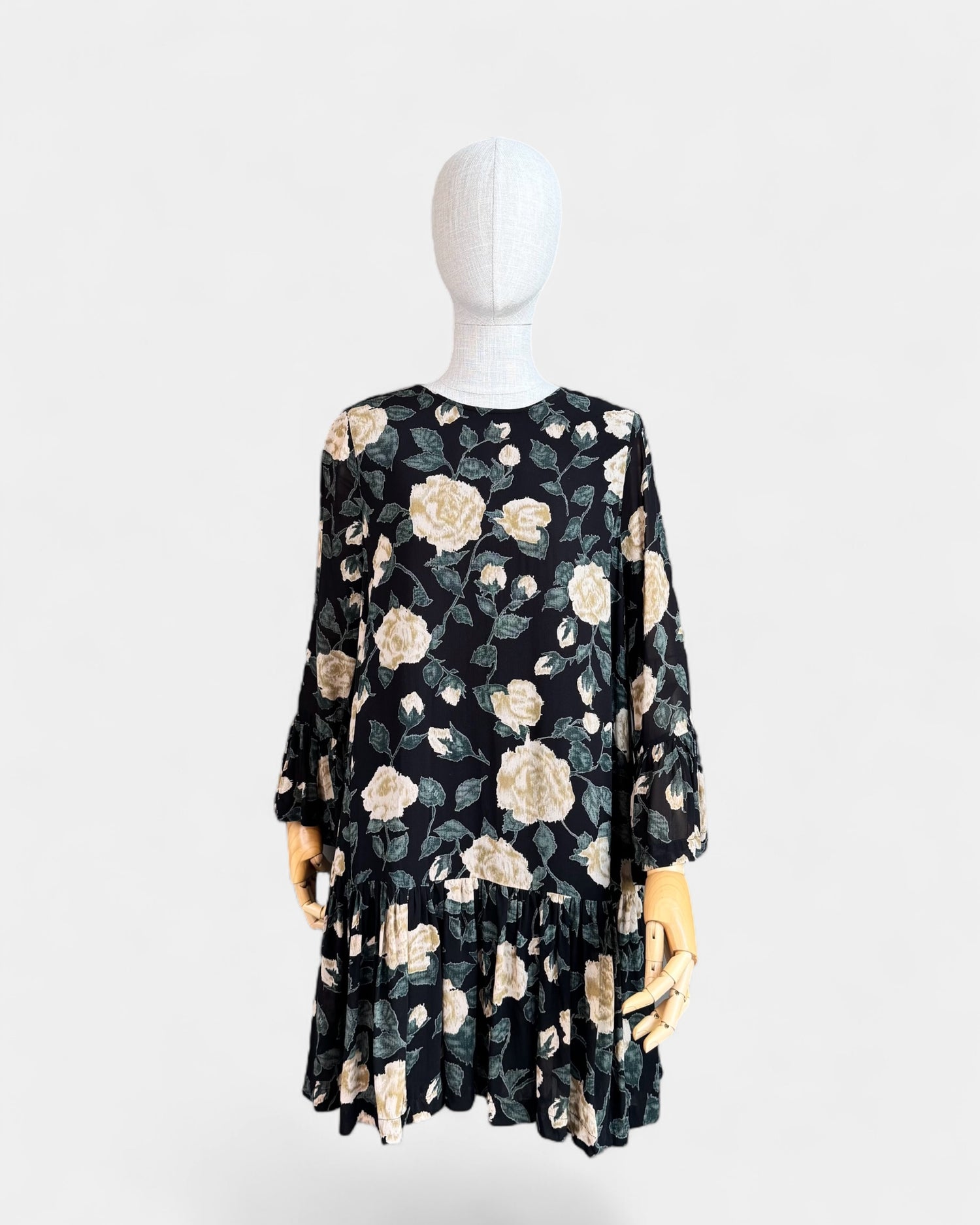 Cette robe fluide en chiffon doublé présente un imprimé floral sur fond noir. Elle offre une coupe droite avec des manches longues légèrement froncées et une encolure ronde. Le bas de la robe est souligné par un volant discret, ajoutant du mouvement à la silhouette. Le tissu léger et doublé assure un tombé confortable sans transparence. La robe se ferme discrètement à l’arrière par une petite fente boutonnée.