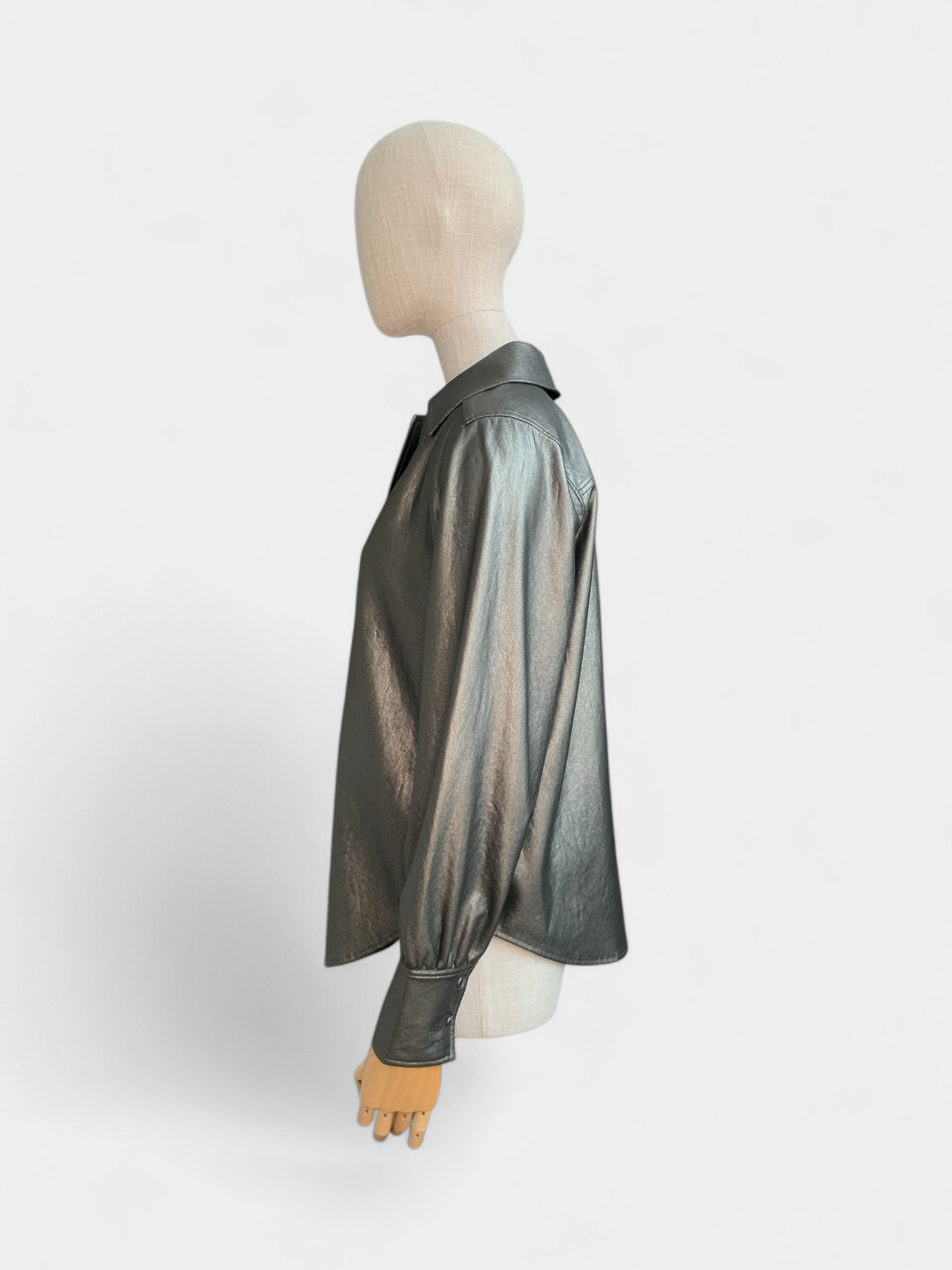 Cette chemise Brochu Walker a une finition métallisée, un col classique et des boutons-pression. Elle est conçue avec des manches longues et des poignets boutonnés. Son style épuré convient à différentes occasions.