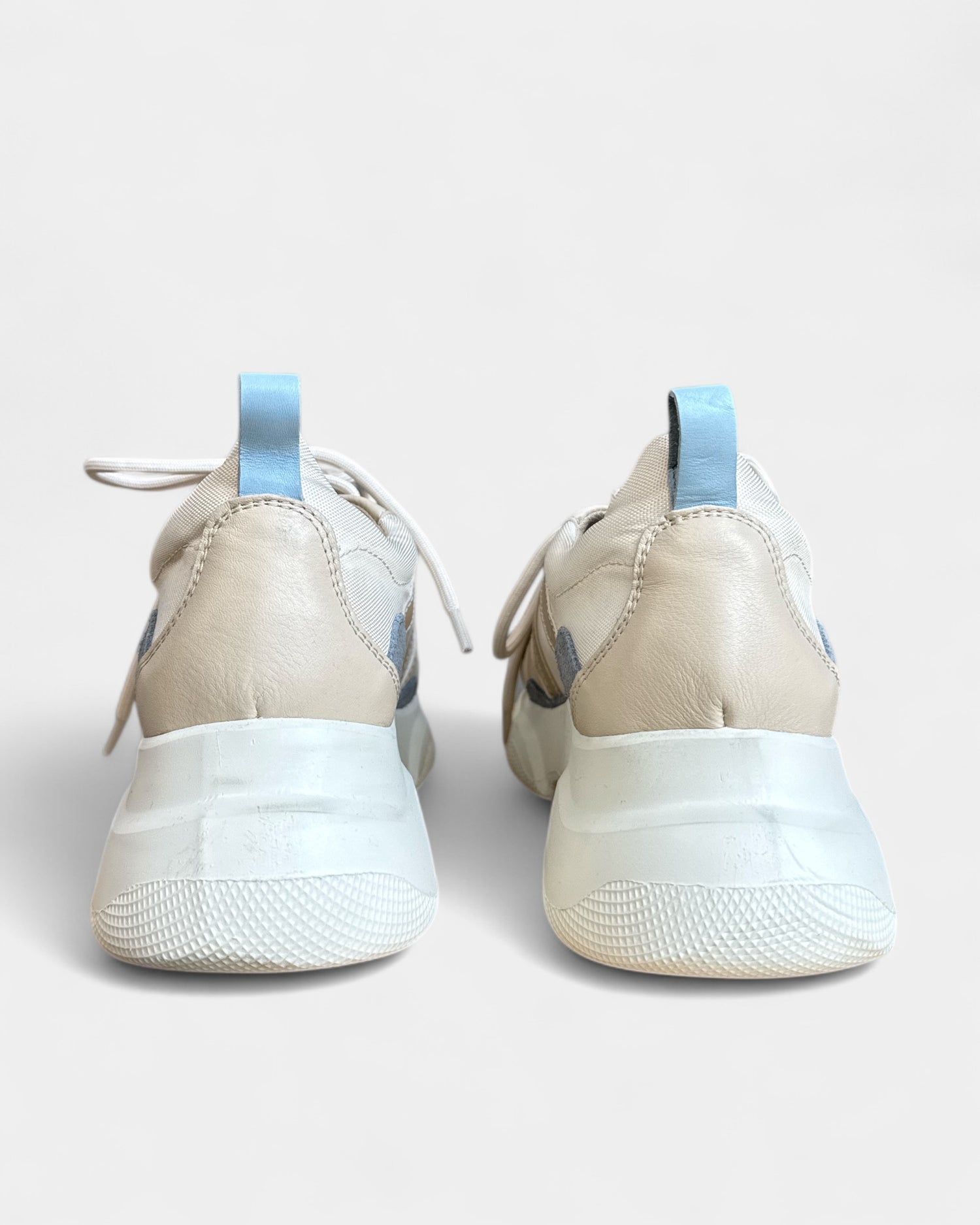 Baskets Canal St Martin, coloris beige, bleu clair et blanc cassé. Design moderne avec semelle épaisse blanche, détails en suède et empiècements en cuir et toile. Légères et confortables, parfaites pour un look casual urbain.